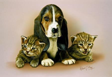 Basset Hound Pup & Kittens giclee print from an original gouache painting by Robert J. May.