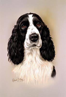Black & White English Springer Spaniel head study giclee print from an original gouache painting by Robert J. May.