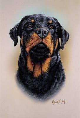 Rottweiler head study giclee print from an original gouache painting by Robert J. May.