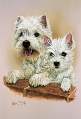 West Highland White Terrier & Pup head study giclee print from an original gouache painting by Robert J. May.